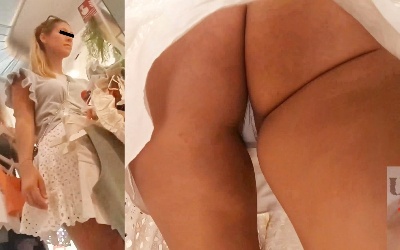 注目は最後から二番目に登場する純白ミニワンピ姿のスレンダー長身モデルです。バス停で待機中の所へ背後から近づき逆さ撮りしてみると、現場を風が吹き抜け純白Tバックから背中まで丸見えの絶景をカメラに収めることに成功しました。