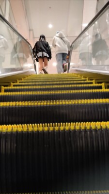 ら伸びる白い太ももが、柔らかな光の中でほのかに輝く。エスカレーターを上がる瞬間、足の動きに合わせてスカー