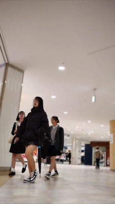 冬のショッピングモール、暖かな照明の下を歩く2人組。厚手のダウンに包まれながらも、短いプリーツスカートか