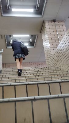 段差ごとにスカートの裾が持ち上がり、太ももの柔らかな曲線が一瞬だけ露わになります。