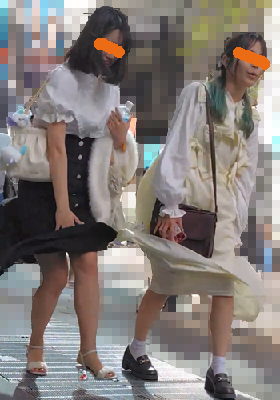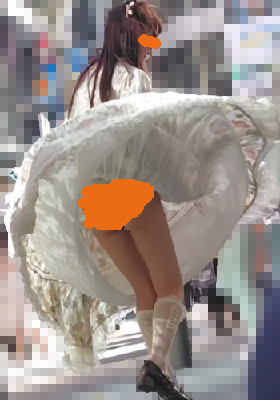 下から吹き上げる風にまくり上げられるスカート