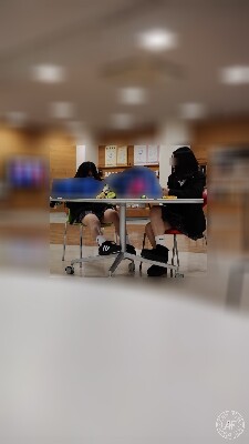 ショッピングモール内の椅子に腰掛けた2組の女子が、無意識に脚を組み替える仕草で、プリーツスカートが軽く揺れ、ソックスと肌の境目がチラリと覗く。