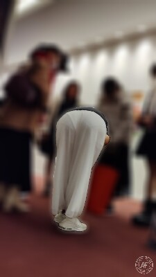 最後に現れる白いワイドパンツの女性が、自然に前屈みになる瞬間、柔らかく張った布地に淡いラインがほのかに浮かび上がり、全体を優しい余韻で締めくくる。