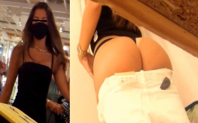 ある意味メインの2人目の美人モデルは、アパレルショップ試着室スタジオでの着替えの撮影に成功。上下黒のセクシー下着で鼠径部には日焼け跡がクッキリのドエロ娘でした。これは直接関係のない話ですが、試着したズボンを脱ぐ際は、とても売り物を扱っているとは思えない雑な脱ぎ方でびっくりしました。