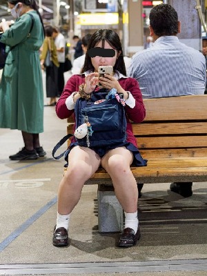 駅のベンチに座っているシチュエーションでむちっとした脚がスカートから伸びているかわいい女の子