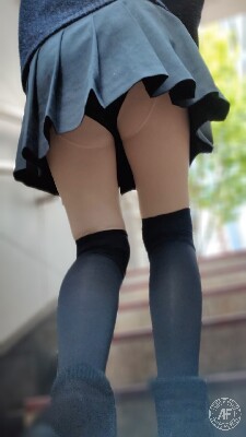 ミニスカートをはいた女性が階段を上る姿では、プリーツが軽く翻り、黒いパンツの輪郭がふとした動きで一瞬だけ強調される。