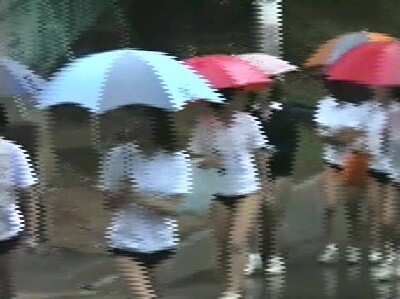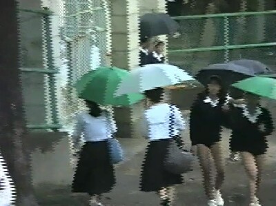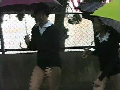 雨天決行の体育祭風作品。上は制服、下はブルマー姿で登校しています。