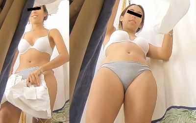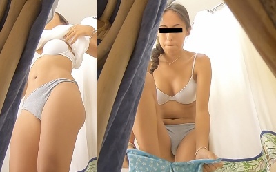 その後の2人はどちらも試着ブースでの着替え撮影です。ママと一緒に試着室の中で着替える様子をカーテンの下の隙間からの撮影でパーフェクトな下着姿を整った顔と共にじっくりと撮影する事に成功しています。